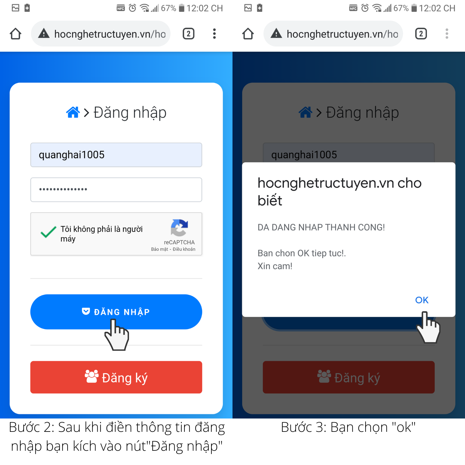 Bước 2: Bạn truy cập vào trang web: hocnghetructuyen.vn và làm theo hướng dẫn như hình bên dưới.